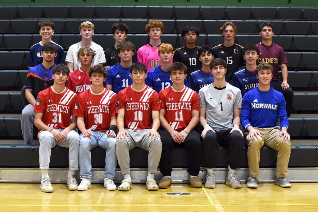 All-FCIAC Boys Soccer First Team – From left, front row, Juan Bruzzone, Greenwich; Santiago Lattuada, Greenwich; Matthew Maloney, Greenwich; Pietro Carvalho, Greenwich; Benjamin Voellmicke, Ridgefield; and Dalton Bury, Norwalk; middle row, Gabriel Lopes, Danbury; Will Arnold, New Canaan; Charles Jones, Fairfield Ludlowe; Ian Moore, Fairfield Ludlowe; Kevin Segura, Brien McMahon; and Justin Rich, Brien McMahon; back row, Finn Burke, Wilton; Cormac Mulvey, Staples; Mateus Almeida, Trumbull; Connor Hughes, Trumbull; Noel Vargas, Stamford; Tyler Szemplinski, Stamford; and Lucas Auten, St. Joseph.