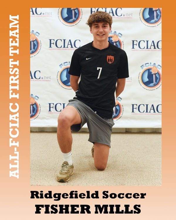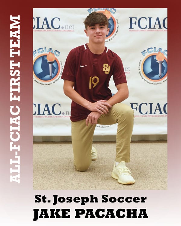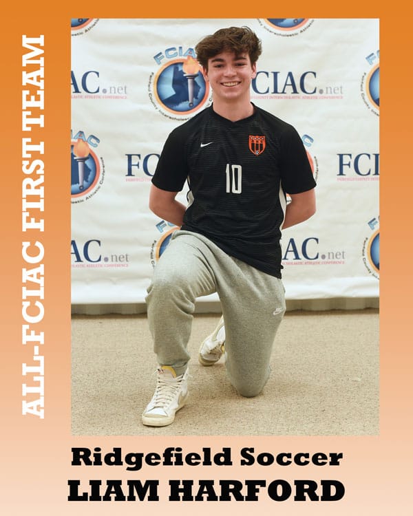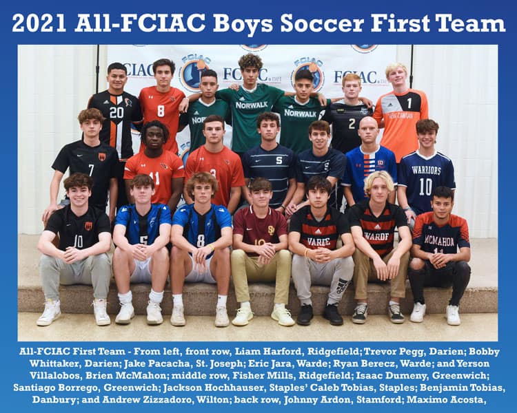 All-FCIAC First Team – From left, front row, Liam Harford, Ridgefield; Trevor Pegg, Darien; Bobby Whittaker, Darien; Jake Pacacha, St. Joseph; Eric Jara, Warde; Ryan Berecz, Warde; and Yerson Villalobos, Brien McMahon; middle row, Fisher Mills, Ridgefield; Isaac Dumeny, Greenwich; Santiago Borrego, Greenwich; Jackson Hochhauser, Staples’ Caleb Tobias, Staples; Benjamin Tobias, Danbury; and Andrew Zizzadoro, Wilton; back row, Johnny Ardon, Stamford; Maximo Acosta, Greenwich; Diego Ramirez, Norwalk; Brandon Ramirez, Norwalk; Mateo Cano, Norwalk; Sean Brennan, Trumbull; and Alex Wolter, New Canaan.
