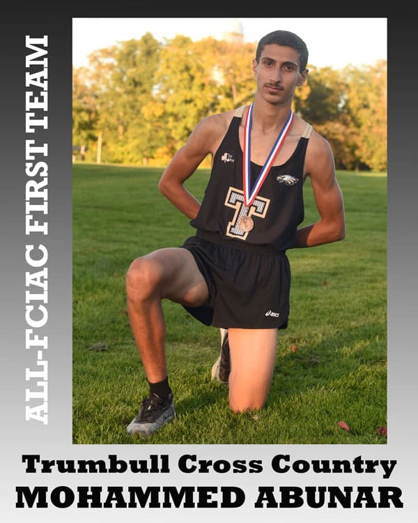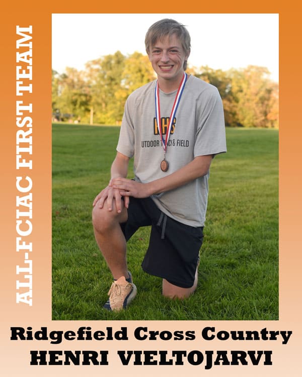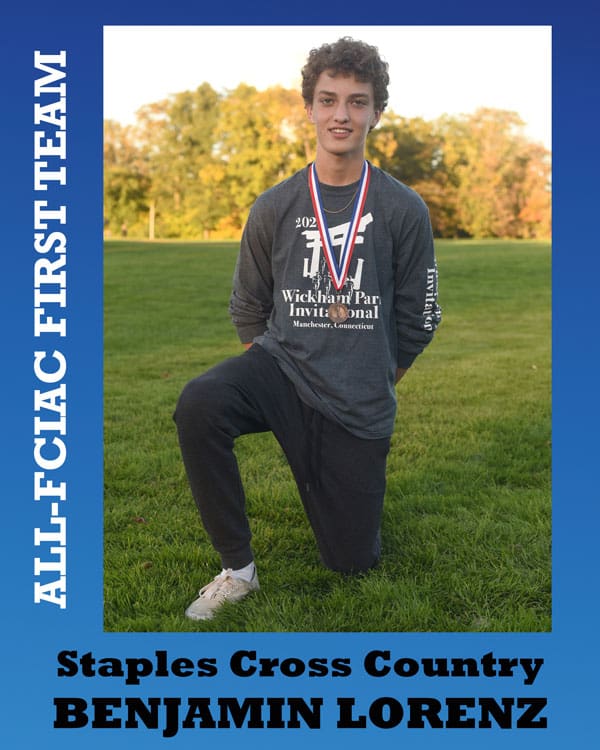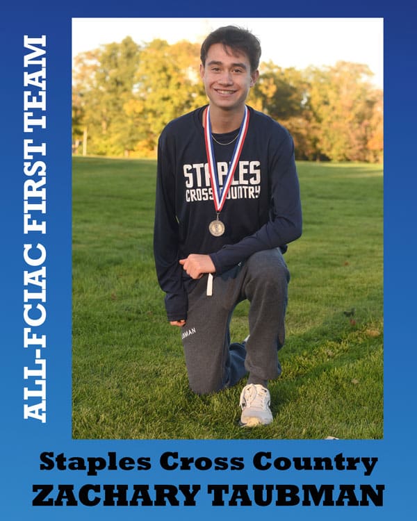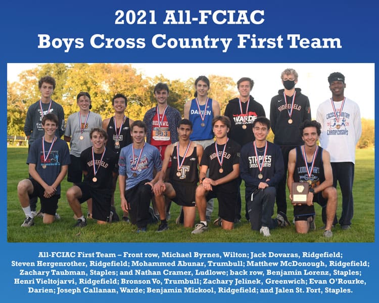 All-FCIAC First Team – Front row, Michael Byrnes, Wilton; Jack Dovaras, Ridgefield; Steven Hergenrother, Ridgefield; Mohammed Abunar, Trumbull; Matthew McDonough, Ridgefield; Zachary Taubman, Staples; and Nathan Cramer, Ludlowe; back row, Benjamin Lorenz, Staples; Henri Vieltojarvi, Ridgefield; Bronson Vo, Trumbull; Zachary Jelinek, Greenwich; Evan O’Rourke, Darien; Joseph Callanan, Warde; Benjamin Mickool, Ridgefield; and Jalen St. Fort, Staples.