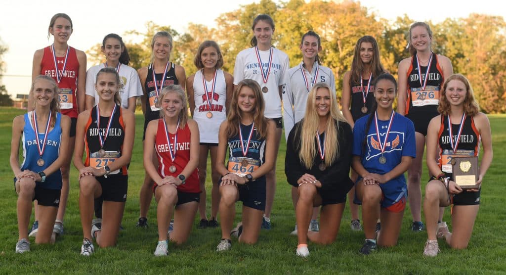 All-FCIAC First Team – Front row, Julianne Teitler, Darien; Georgia Keller, Ridgefield; Esme Daplyn, Greenwich; Emily Mrakovcic, Wilton; Kali Holden, Trumbull; Stephanie Queiroz, Danbury; and Katie Rector, Ridgefield; back row, Anna Weiksner, Greenwich; Evelyn Marchand, Trumbull; Allie Burt, Warde; Radea Ralev, New Canaan; Mairead Clas, Darien; Josie Dolan, Staples; Madison Stevener, Warde; and Deirdre Franagan, Ridgefield.