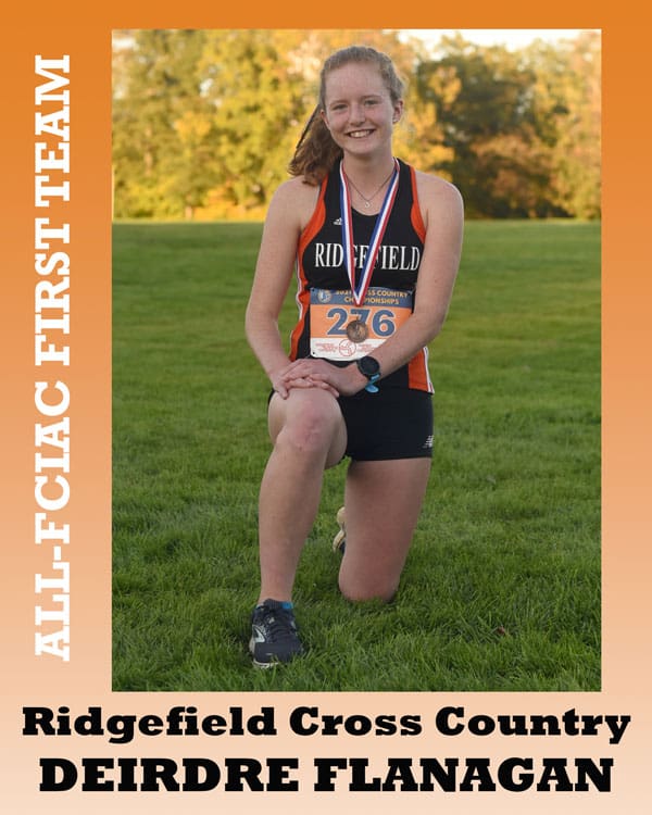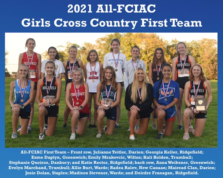 All-FCIAC First Team – Front row, Julianne Teitler, Darien; Georgia Keller, Ridgefield; Esme Daplyn, Greenwich; Emily Mrakovcic, Wilton; Kali Holden, Trumbull; Stephanie Queiroz, Danbury; and Katie Rector, Ridgefield; back row, Anna Weiksner, Greenwich; Evelyn Marchand, Trumbull; Allie Burt, Warde; Radea Ralev, New Canaan; Mairead Clas, Darien; Josie Dolan, Staples; Madison Stevener, Warde; and Deirdre Franagan, Ridgefield.