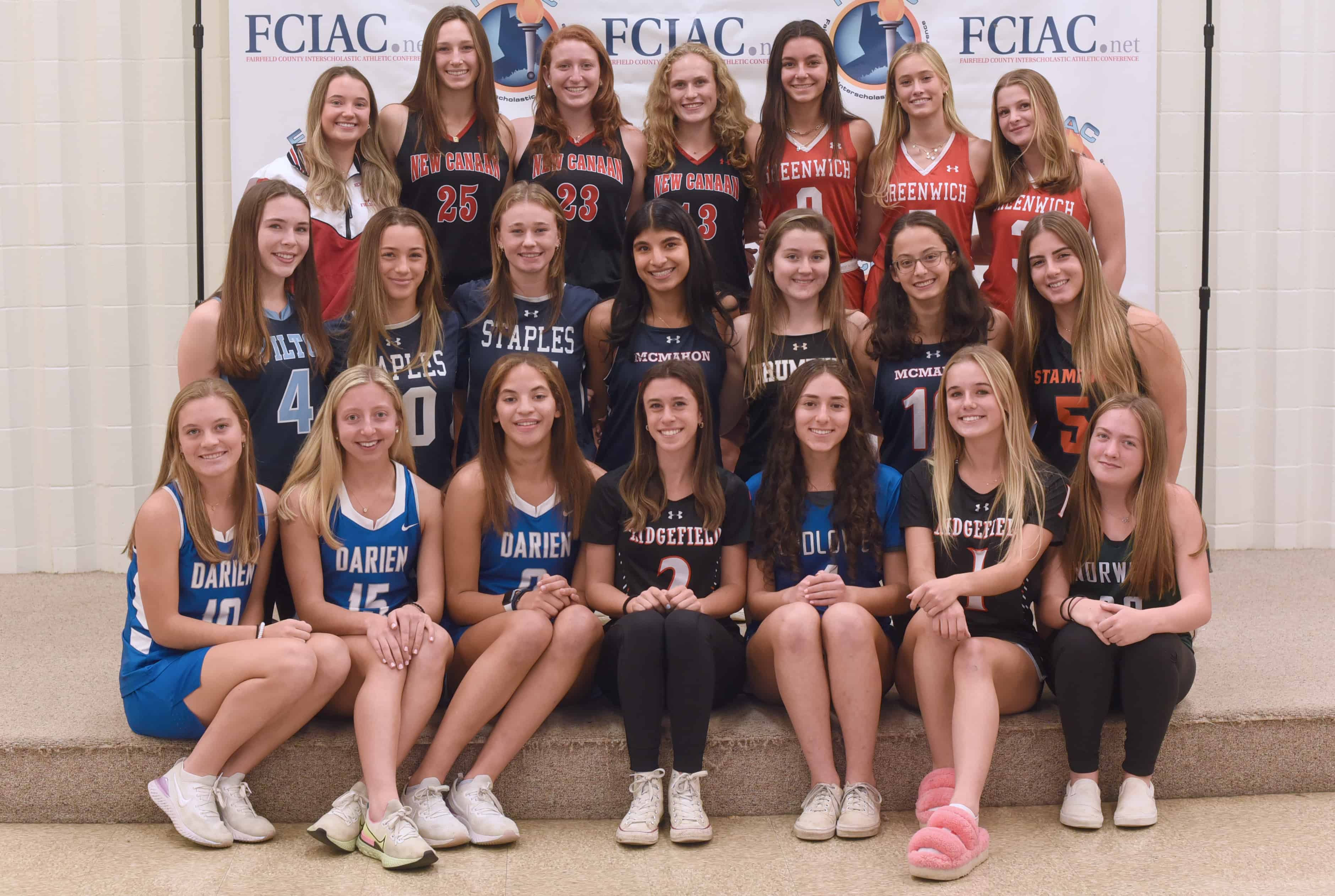 All-FCIAC First Team – From left, front row, Ryan Hapgood, Darien; Kaci Benoit, Darien; Raina Johns, Darien; Julia Carrozza, Ridgefield; Sofia LaFalce, Ludlowe; Ozzy Redrup; and Kaelyn Fogelson, Norwalk; middle row, Charlotte Casiraghi, Wilton; Jess Leon, Staples; Lily Harrington, Staples; Jade Marin, Brien McMahon; Lyndsay Guzzetta, Trumbull; Leah Pascarelli, Brien McMahon; and Mikayla Gentile, Stamford; back row, Grace Gilman, New Canaan; Polly Parsons-Hills, New Canaan; Molly Mitchell, New Canaan; Zoey Bennett, New Canaan; Isa Lattuada, Greenwich; Klara Mueffelmann, Greenwich; and Justine Liguori, Greenwich.
