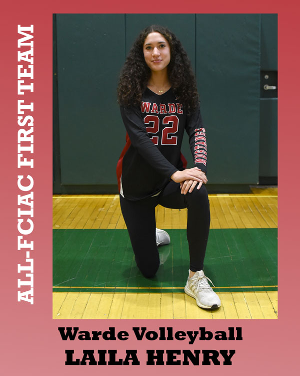 All-FCIAC Girls Volleyball First Team – Front row, Sarah Bernann, Greenwich; Laila Henry, Fairfield Warde; and Joy Houdre, Greenwich; back row, Marin Black, Darien, Defne Ceken, Westhill, and Savannah Leone, Darien.