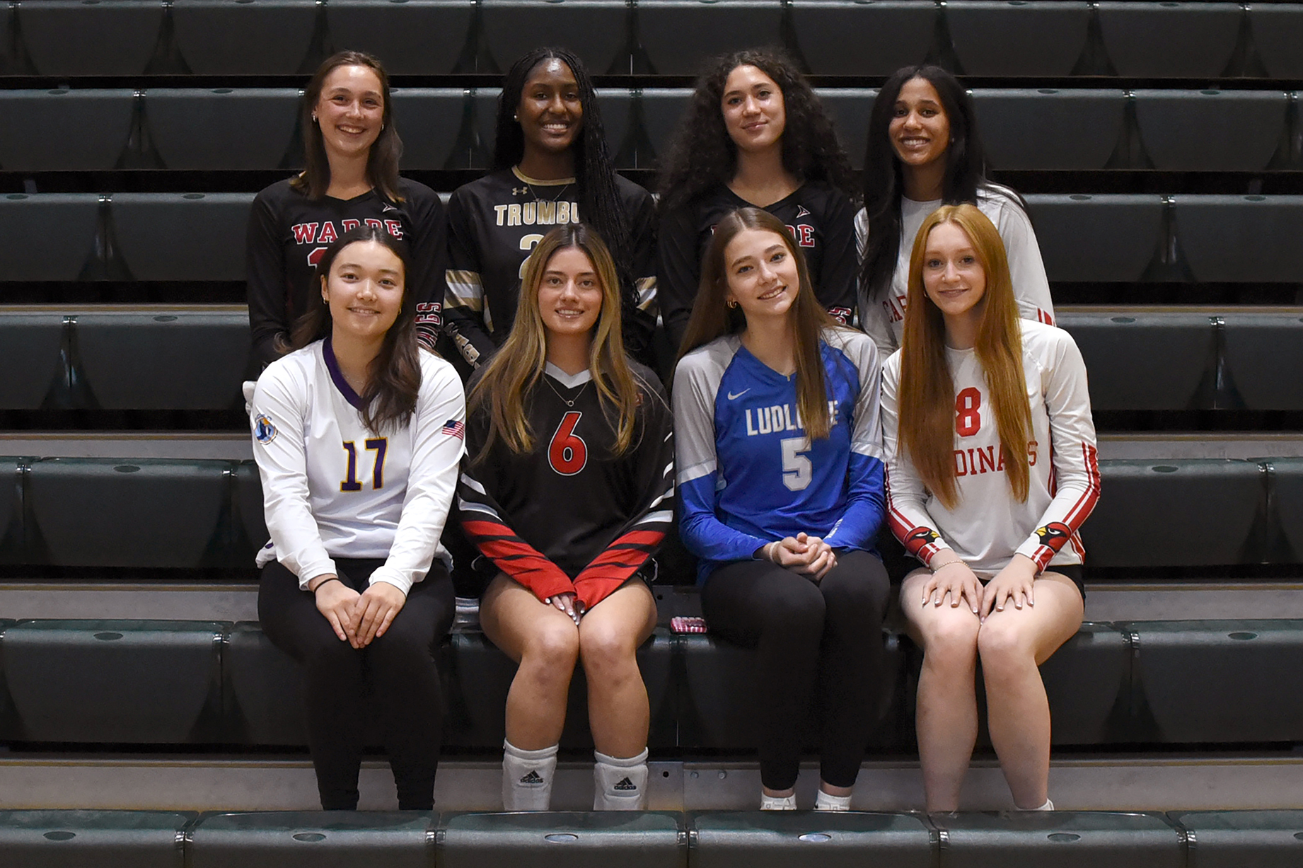 All-FCIAC Girls Volleyball First Team – From left, front row, Angela Russell, Westhill; Mia Lockyear, New Canaan; Becca Karlson, Fairfield Ludlowe; and Heidi Zieme, Greenwich; back row, Ivy Ann Feay, Fairfield Warde; McKenzyi Bell, Trumbull; Laila Henry, Fairfield Warde; and Kayah Armstrong, Greenwich.